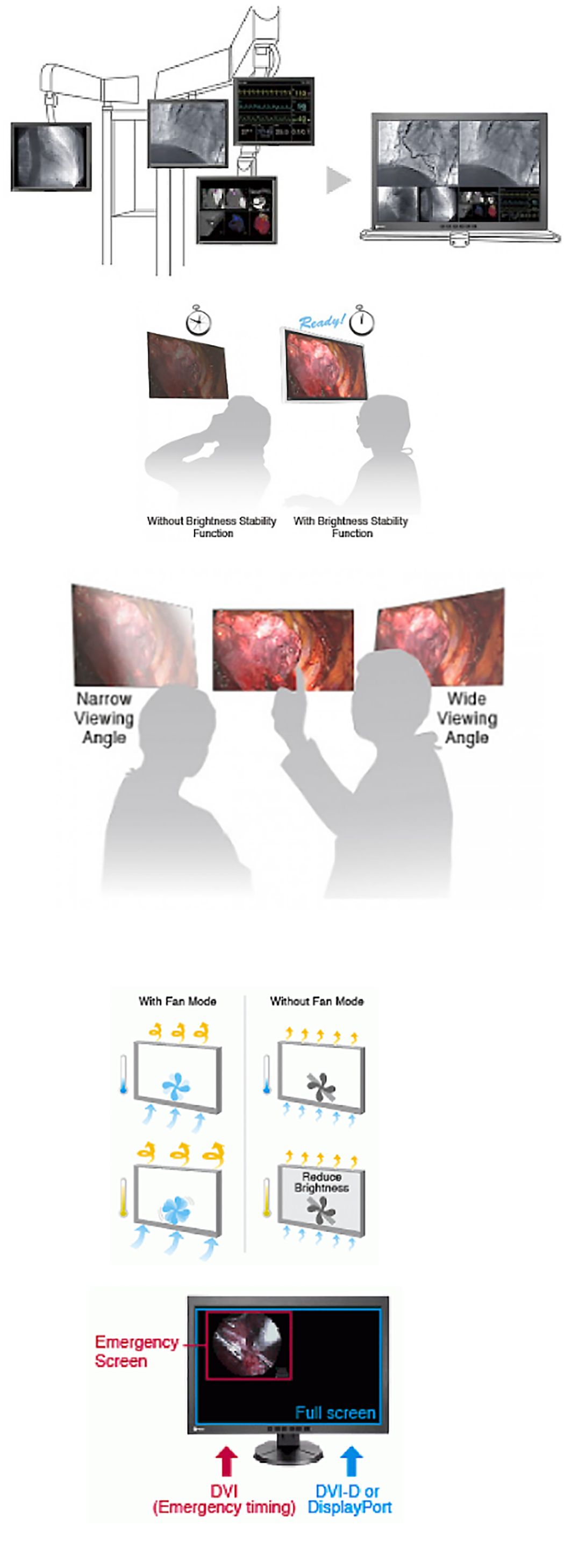 Large widescreen monitors with high resolution can be used instead of single 1 Megapixel monitors in ceiling suspensions. Compared with multi-monitor scenarios, these large screen monitors have no regional color differences or obtrusive bezels, thus reducing eye fatigue and the potential for distraction.